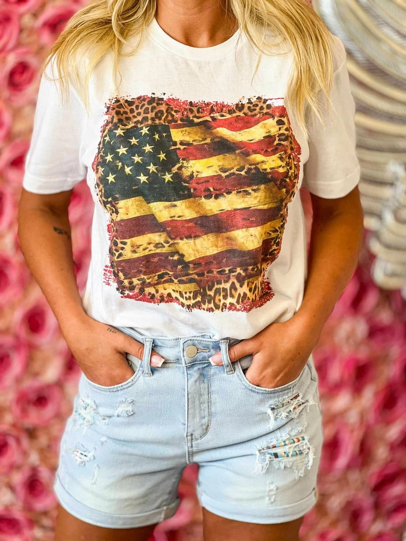 American FlagΒ T-shirt with blingΒ and leopard. Unisex fit. Custom-made just for you!