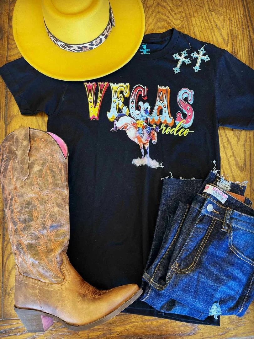 Graphic tees. We are here for them! We found the perfect tee to wearΒ while in VegasΒ or to the rodeo! Perfect for layering and pairing with your sequins! Printed on a black tee. Unisex fit. Custom-made just for you!