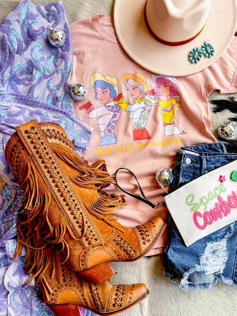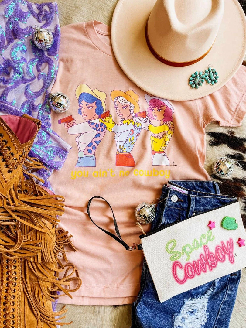 You Ain’t No Cowboy Tee. Printed on a sand dune colored tee. Unisex fit. Custom-made just for you!