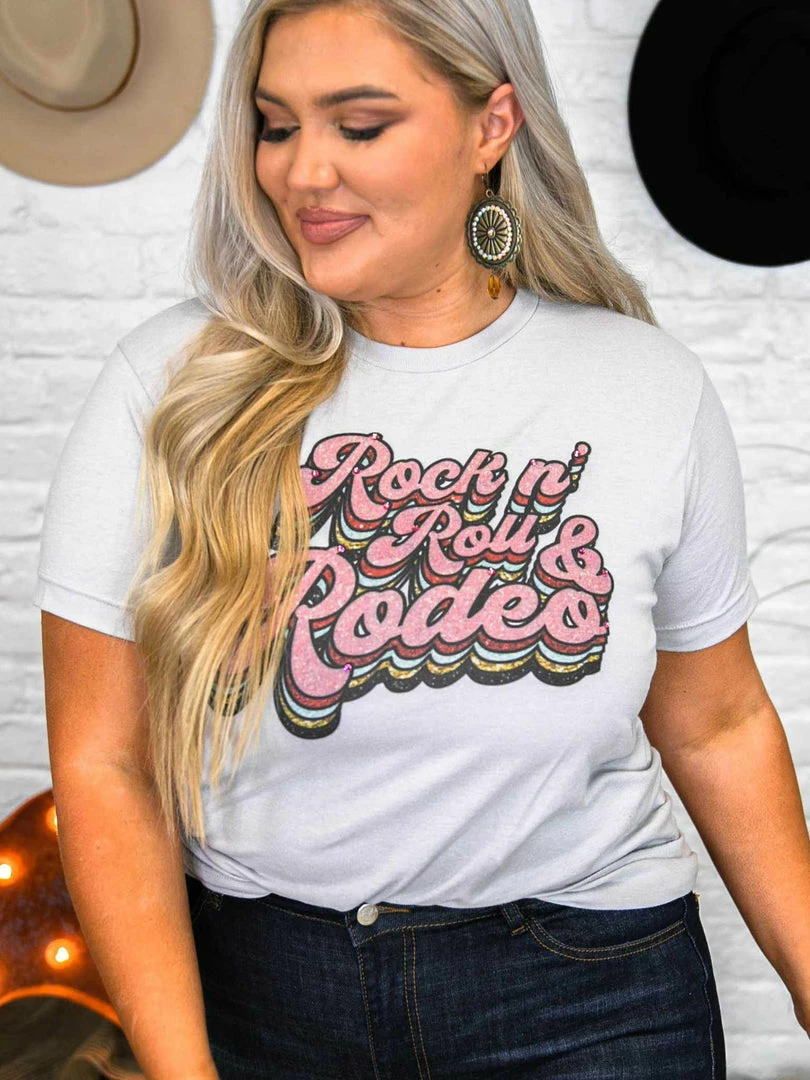 If you love rock n roll and rodeo, this is the tee just for you! Perfect for the edgy cowgirls! The glitter looks real, but it is printed on the tee. True to size, unisex tee. Perfectly paired with leggings or jeans! Bling option available. Printed on a silver-coloredΒ tee.