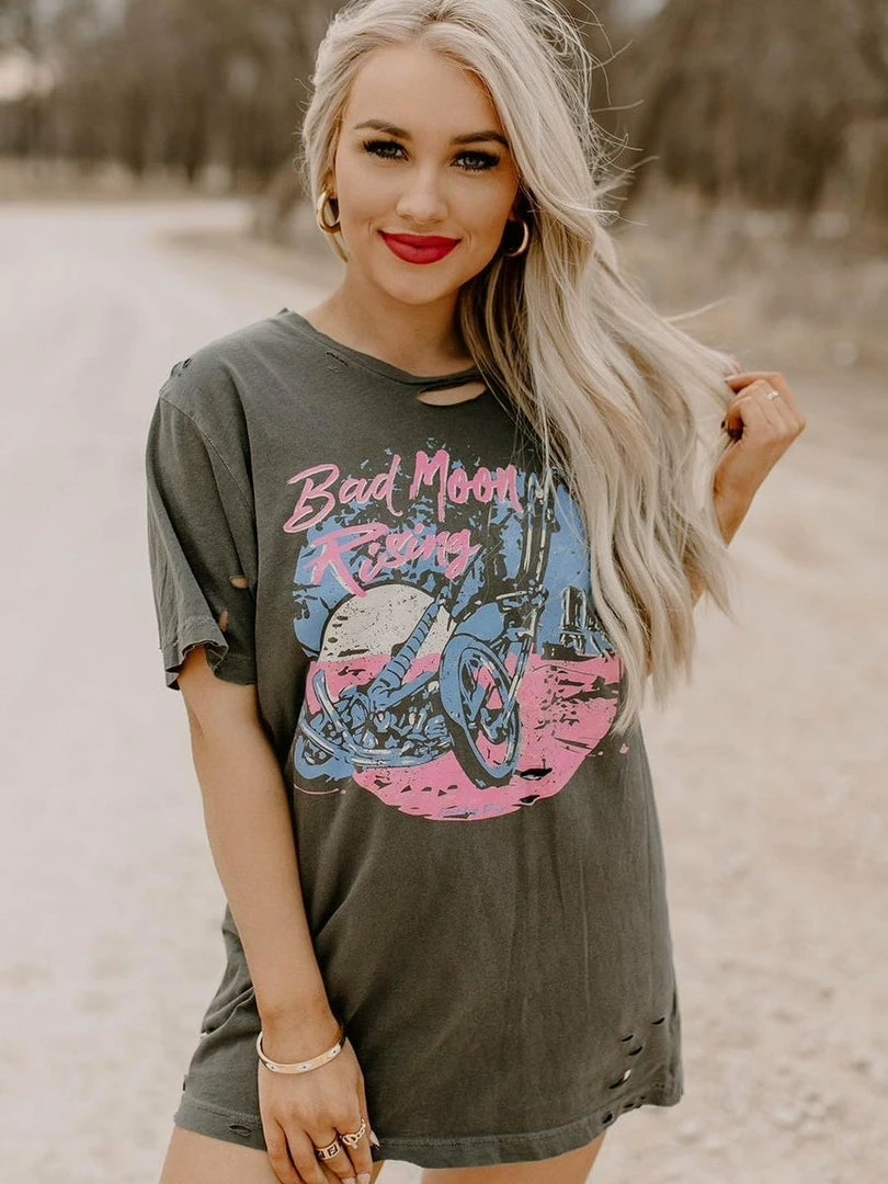 Calling all bad chics! This is the tee! This faded black tee features a a chopper and the bright pink just makes this tee stand out! Perfect for a day riding motorcycles!Β