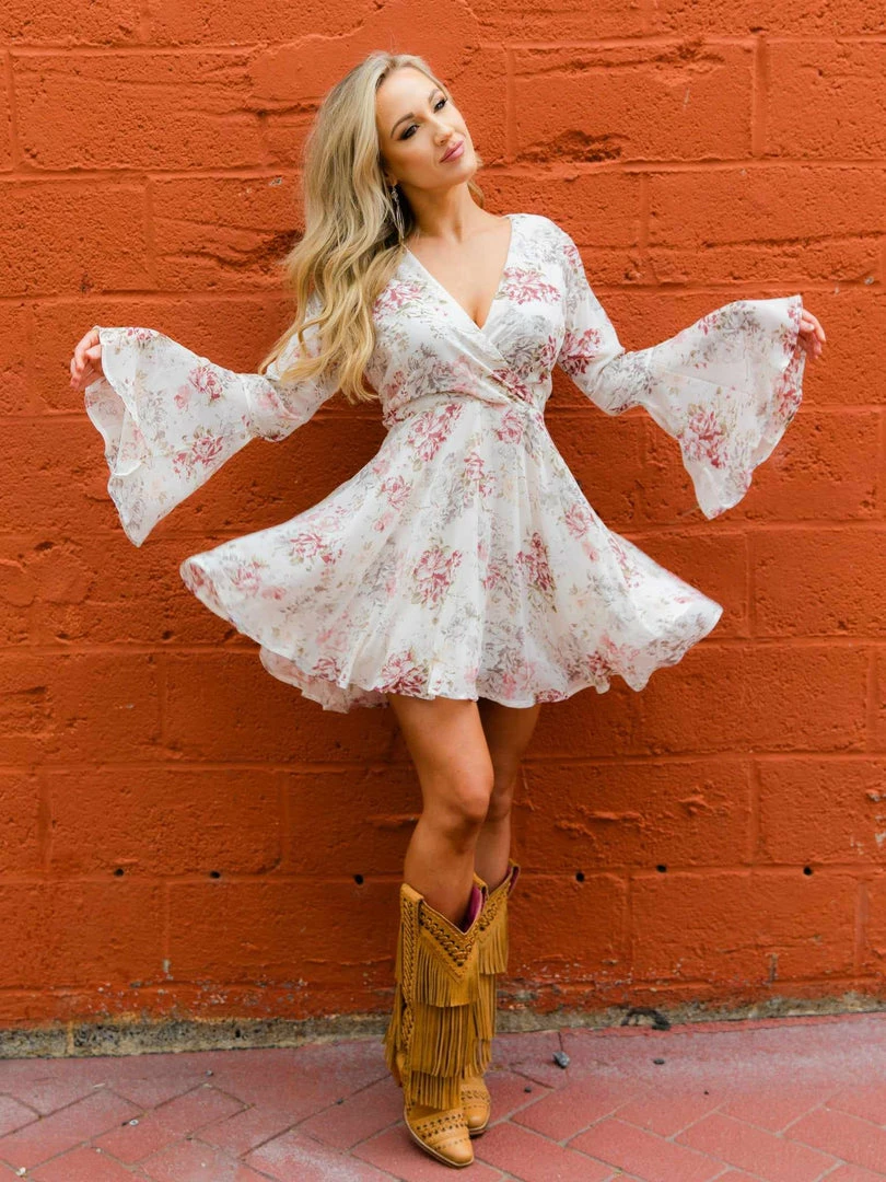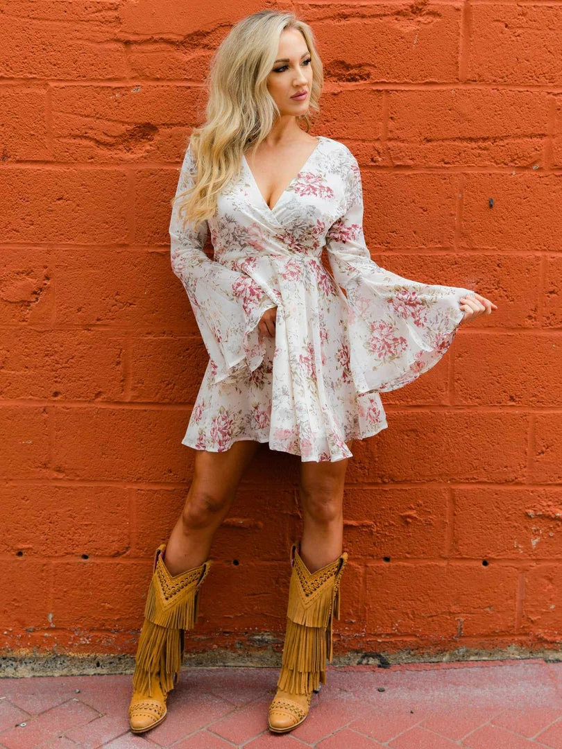 This bell sleeve dress has serious flare, and we don’t mean the cuffs! This white bell-sleeve mini dress boasts a floral pattern that’s as wholesome as it is country! It’s cut just above the knee so this dress is practically begging for a great pair of stomping boots. It even comes in plus size! The deep v-wrap top keeps you cool as a cucumber while looking hot!