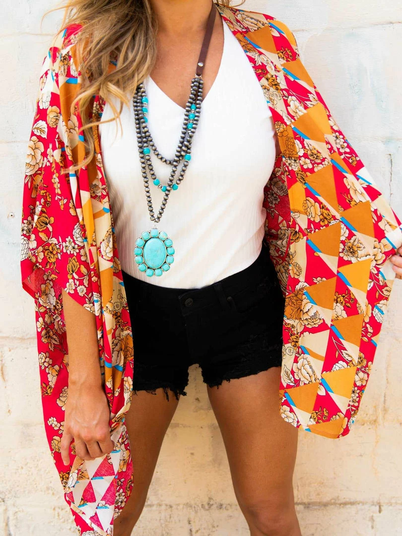 This geometric floral print kimono is a summer must have! This breezy open front kimono literally goes with everything – easy to layer over bodysuits, tanks, tees or even bathing suits!