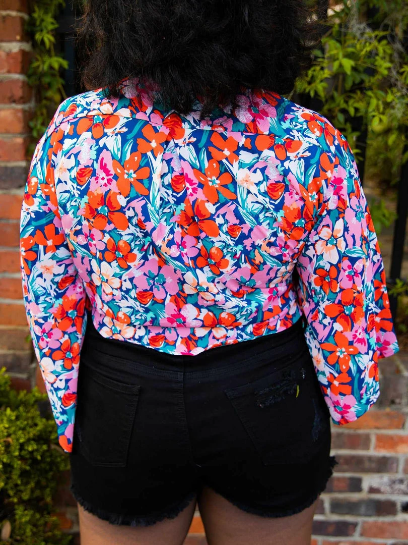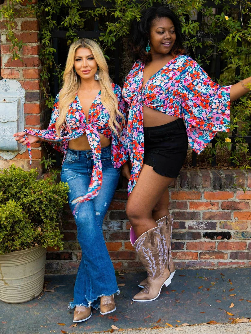 Talk about versatility! This top is going to be the hottest thing this spring and summer! This crop top features a beautiful floral print. It is very flowy and will keep you cool all day and night! If you don’t want to tie it up, you can wear it untied and add a tank under it. The bell sleeves are so comfortable and flowy! Great for all day wear! This top pairs perfectly with your high-waisted denim pants and your favorite denim shorts! Toss on your western cowgirl boots for a southern style or pair with wedges to dress it up!