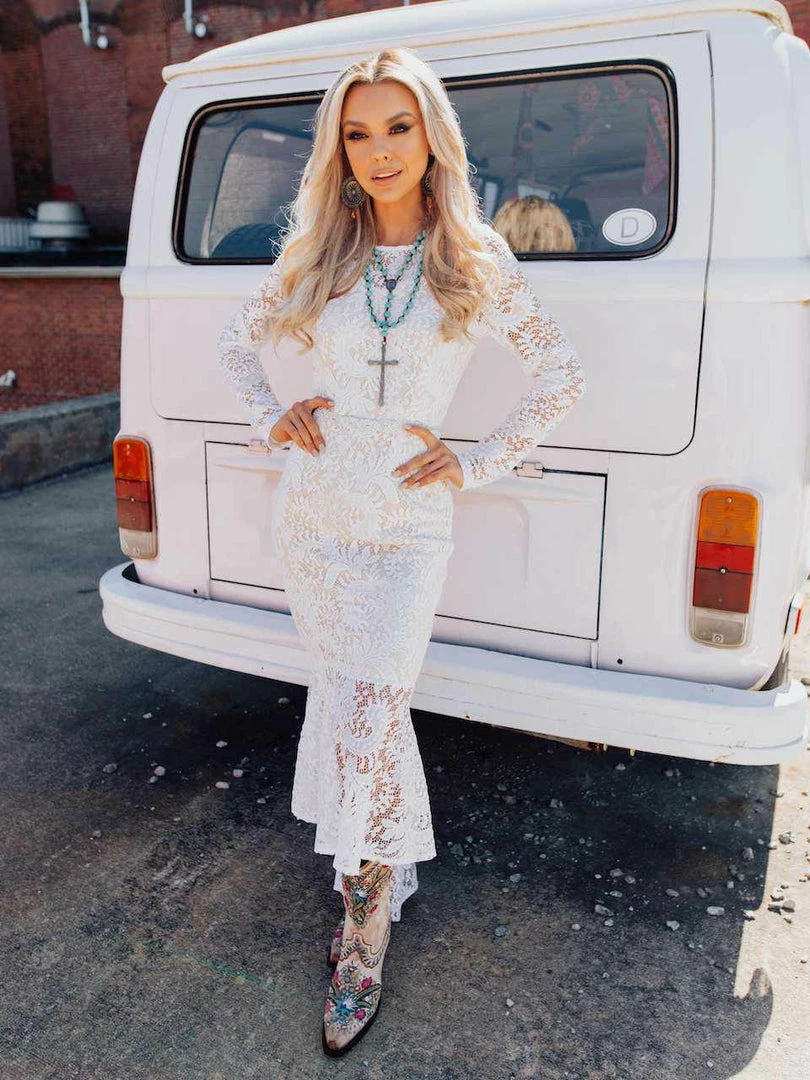 The Always Be Mine Dress is a new take on a classic tea-length style. Featuring all-over lace, long sleeves, neutral lining, a zipper back. Pair it with the Infinite Rhinestone Belt to complete the look.