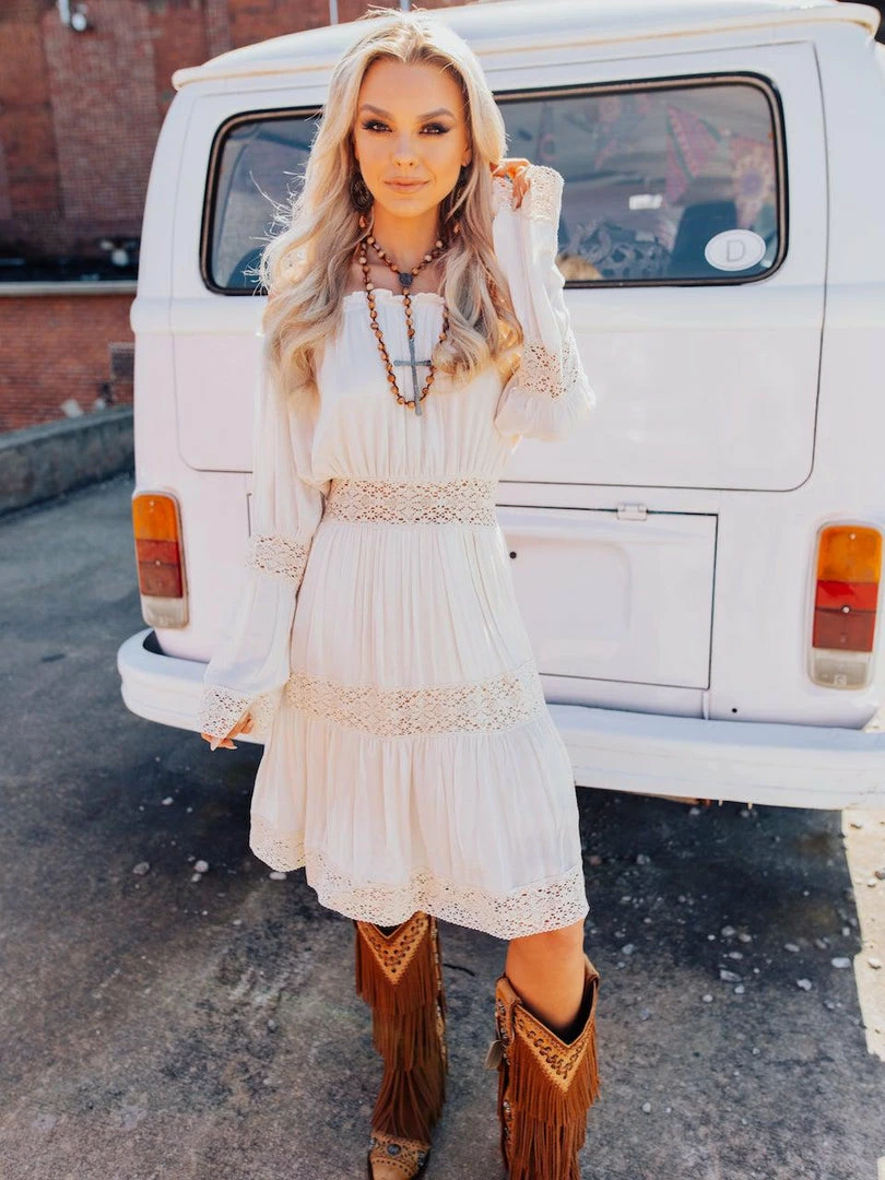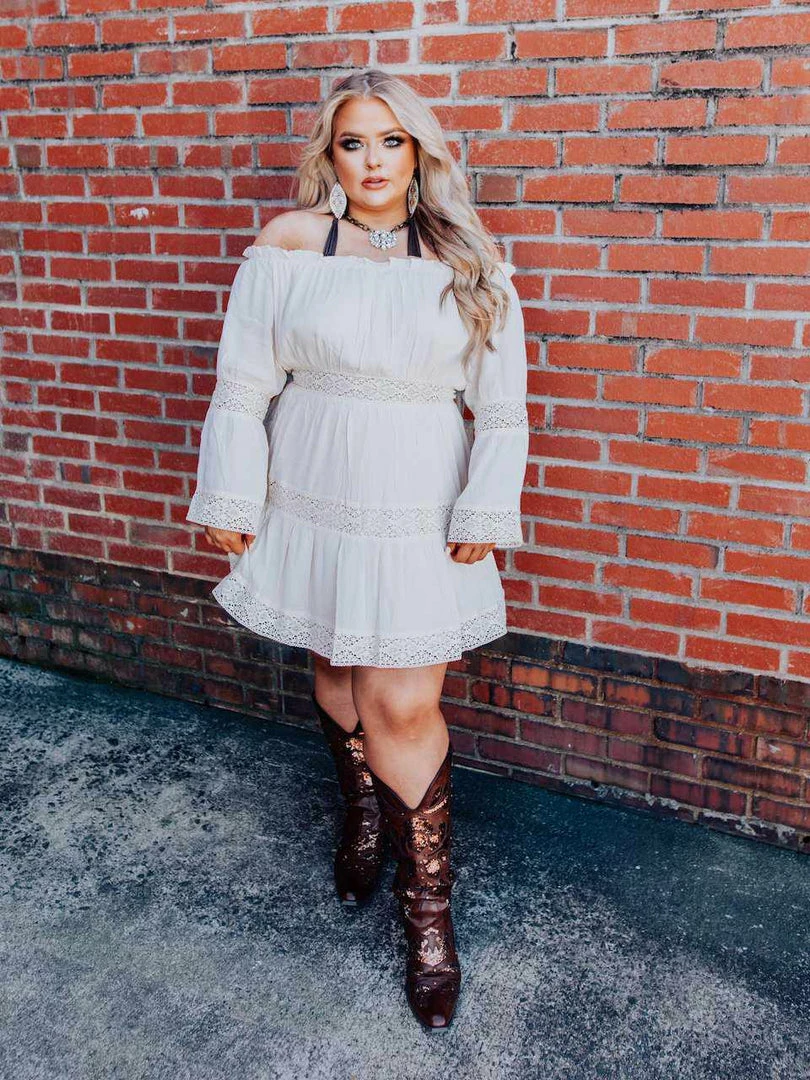 For a minimalist summer look, the Better Together dress features an off-the-shoulder style with long sleeves, a flowy skirt, zipper back, and lace trim. Perfect for nighttime walks on the beach this summer.