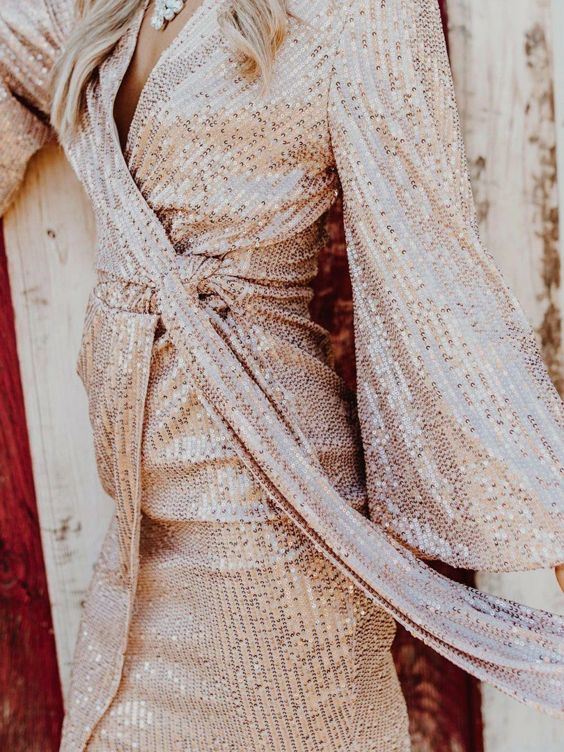 Turn up the glow factor in the “Charlene,” a shimmering gold dot sequin wrap dress with bell sleeves and tie waist. This one is definitely made for making a scene. Part of the SFC collection, Curvy Chic approved, and designed by our owner Liz.