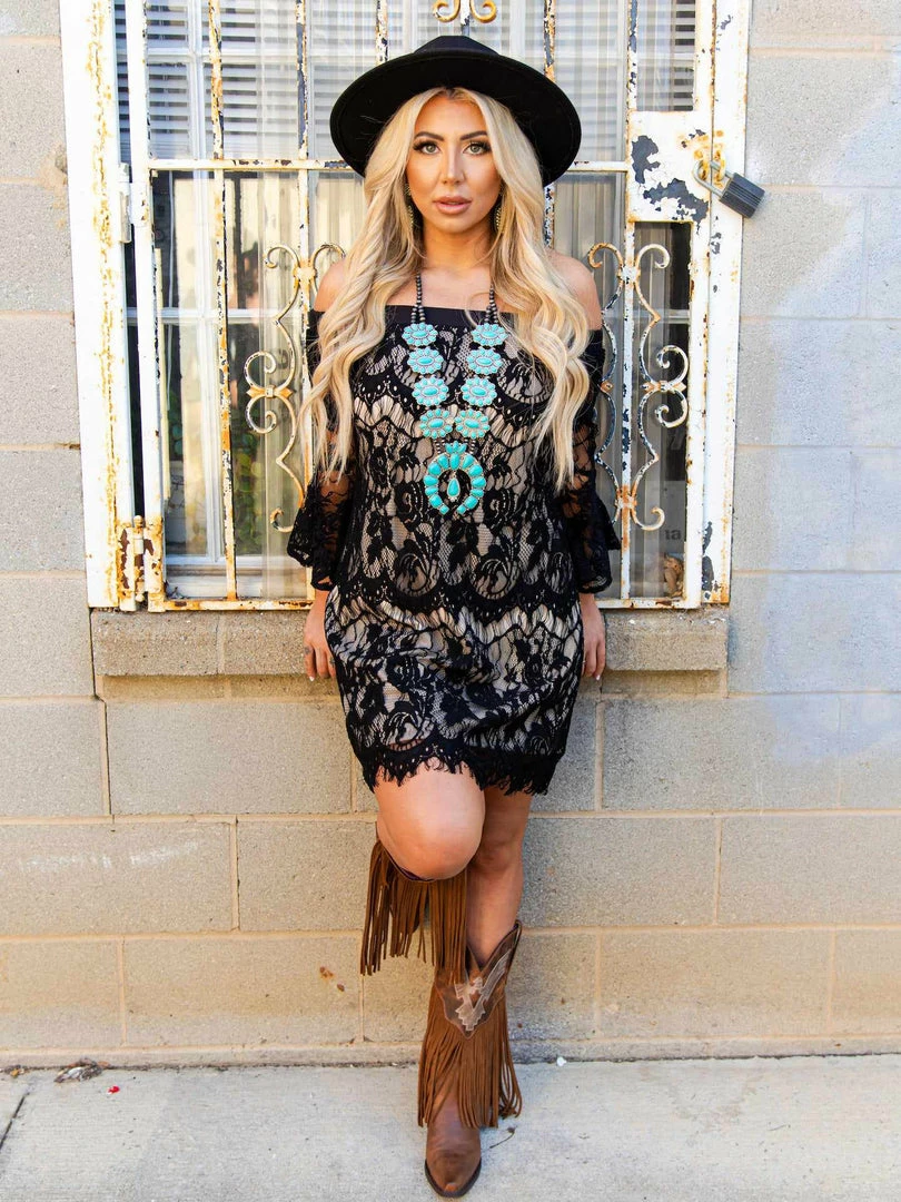 LOVELY! Our “Locked” in Lace Off Shoulder Dress is just GORGEOUS! Stunning for Brides to Be & perfect for Spring & Summer events! This dress features a bell flare sleeve and slit peek-a-boo back! We LOVE a good off shoulder dress here at SFC – it is so flirty & fun for a date night look! True to size & Available in Curvy! Lined for Coverage. Made by Southern Fried Chics.
