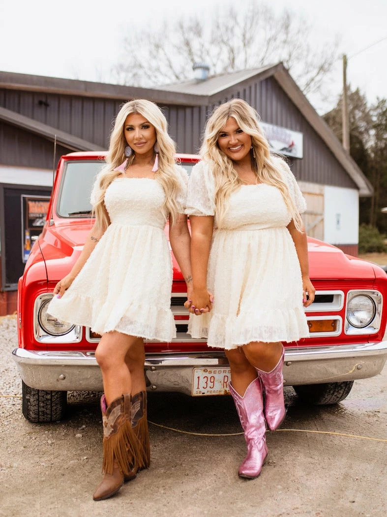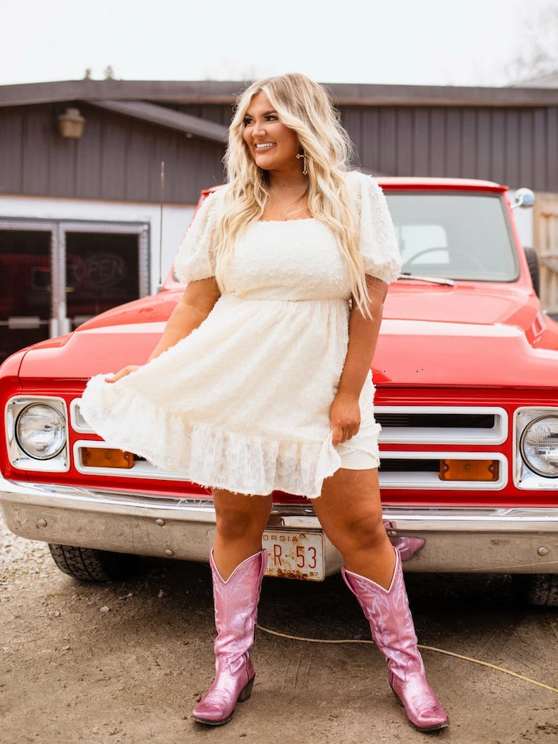 ย Fun and flirty for the “Girl Next Door” Dress. Short sleeve ivory colored dress. This dress features a cute ruffle at the bottom. This is the perfect dress for a Sunday church service or an evening at a concert! The little boho cutie features an elastic back.ย