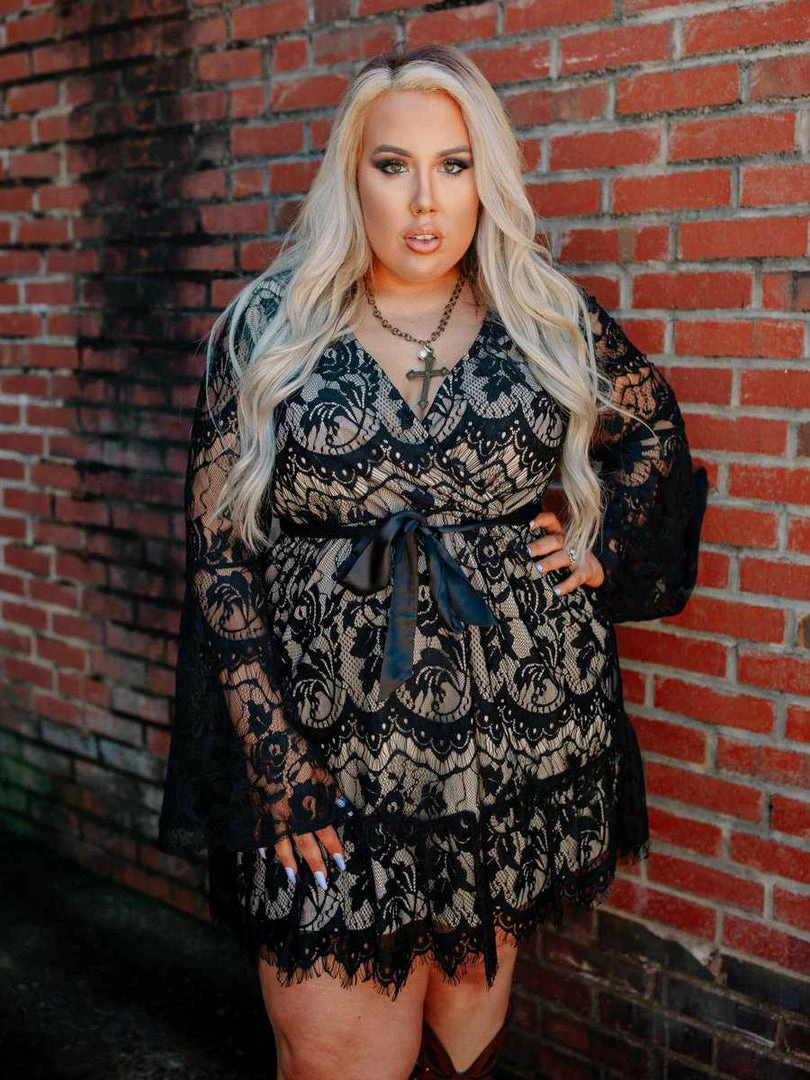 Lace has always been a southern chic trend. That is why our Lacey Belle Dress is going to be your forever dress! Paired with your favorite western boots or dress it up with heels! This dress features a neutral tone lining and has a v-neck neckline with an elastic waist. The sleeves are a beautiful belle sleeve and they are not lined. At the bottom, the dress has a ruffle of lace. A black satin belt is included with this dress, but not attached.