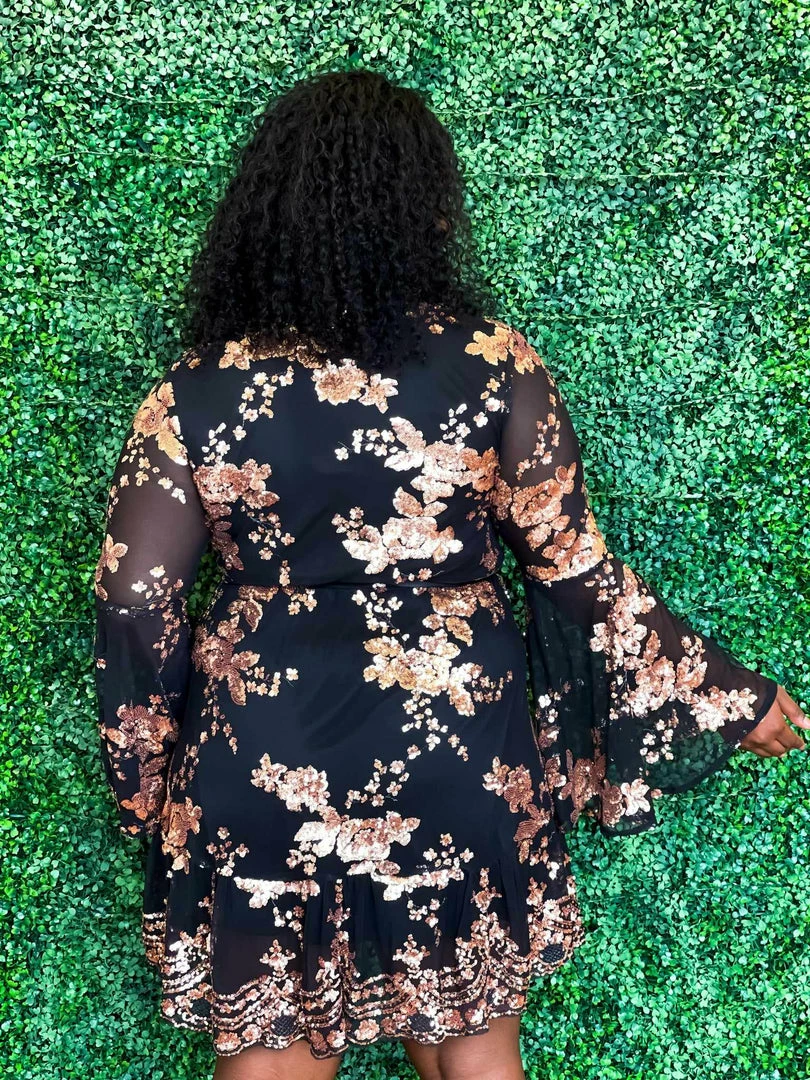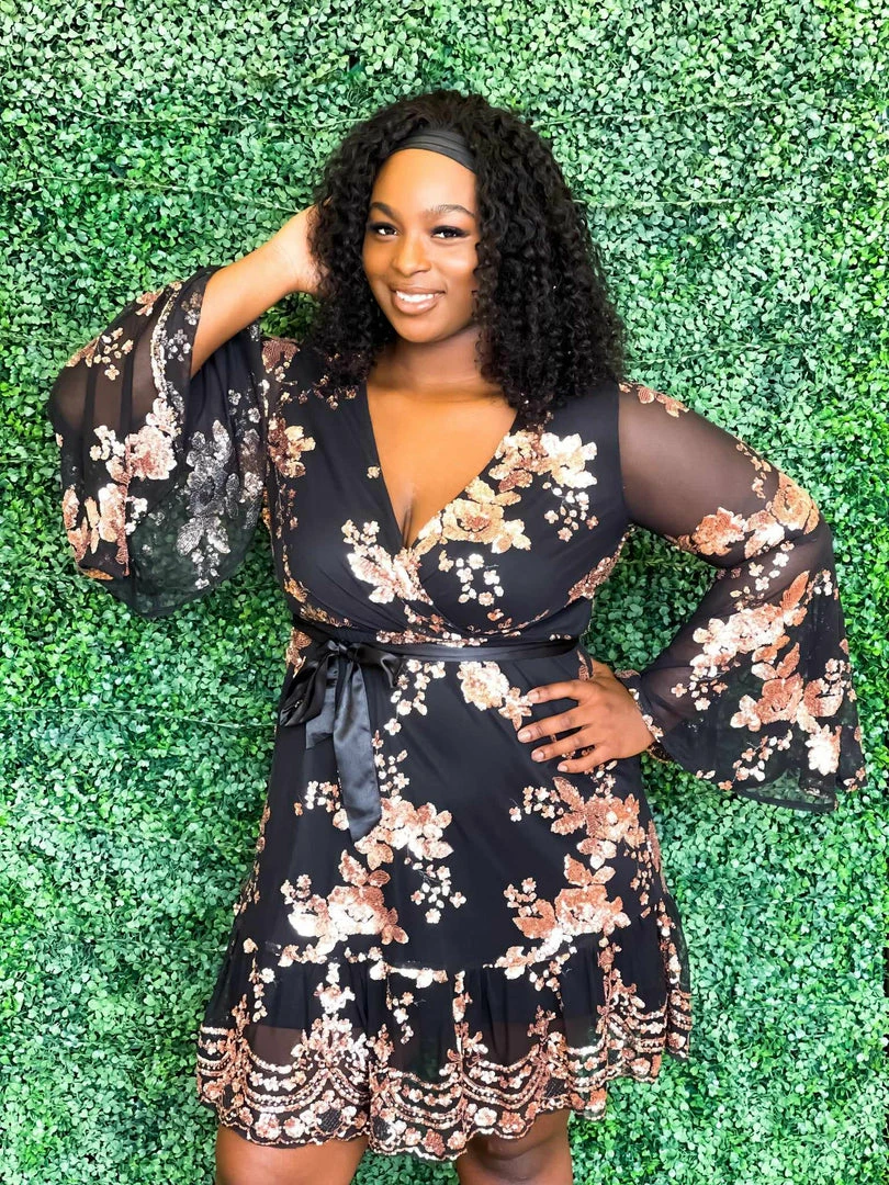 Just like you, this black wrap dress is something special.ย It’s not just any little black dress. This wrap dress rocks rose gold sequins!ย Theย Lacey Belleย is going to be your forever dress, paired with your favorite western boots or dress it up with heels! It fits perfectly and even comes in plus sizes. Itย features aย black tone lining and has a v-neck neckline with an elastic waist, and unlined bell sleeves.ย At the bottom, the dress has a ruffle of lace. A black satin belt is included with this dress, but not attached. The rose gold sequin on the black material is absolutely stunning and so elegant!ย