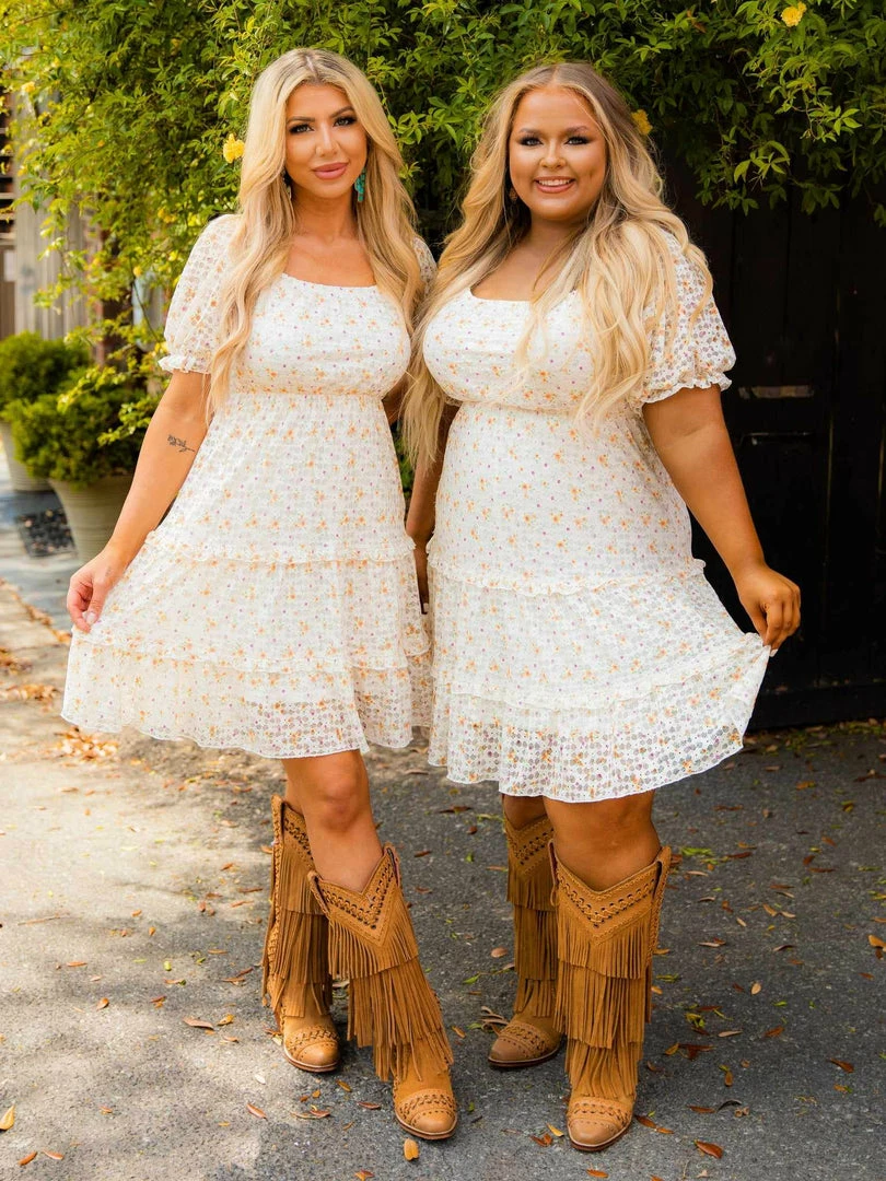 This summer dress is fresh as a daisy – several daisies in fact! This square neck white dress features a delicate daisy print throughout. The capped sleeves and lace detail make this dress the perfect staple to add to your summer wardrobe. Lined for coverage.