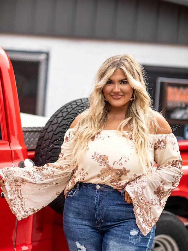 This bell sleeve top is cool in every way possible! It breathes like a dream and the off-shoulder cut is absolutely sassy. So cute and so trendy, the Sequin Talk About It off-shoulder bell sleeve top is fabulous for anywhere you go! The top is perfect dressed up or make it more casual with your denim cutoffs. The bell sleeves are seamless and so elegant. The details are stunning!