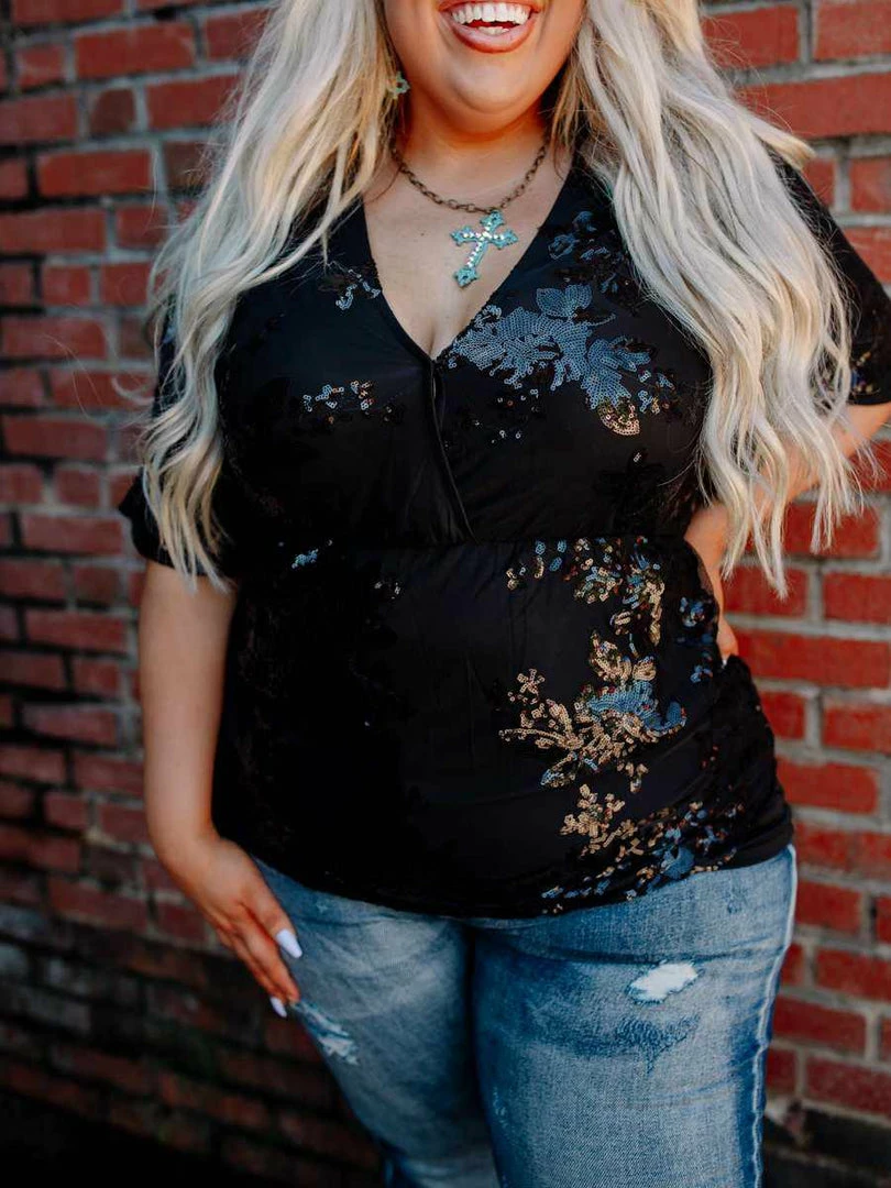 What a way to be a SHOWSTOPPER! Be a head turner while wearing the personal creation of Liz, the owner of Chics Collection! The Sequin Secret Topย sparkles and shines. Just the top you need to shine in the middle of a crowded party, pub or bar! It features a V-neck neckline with a cinched waistline.ย Flattering to anyย body type!
