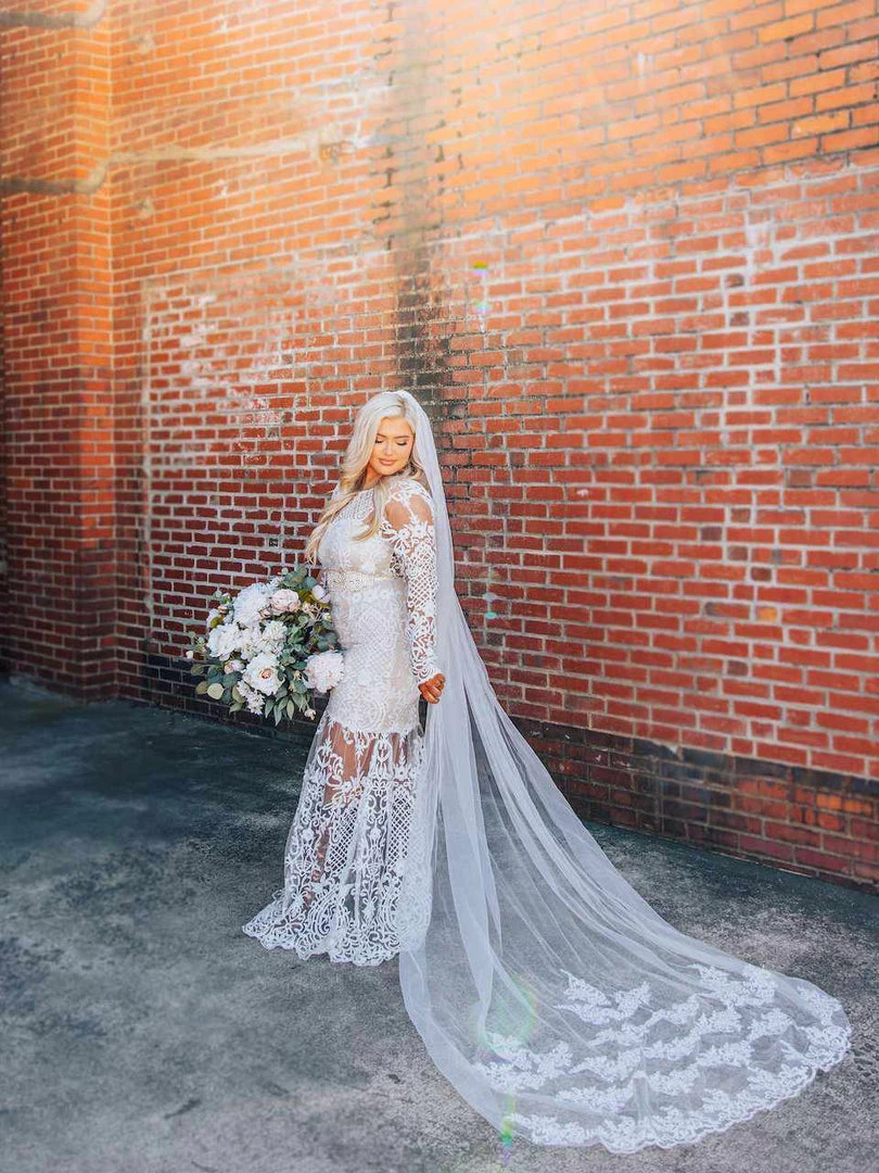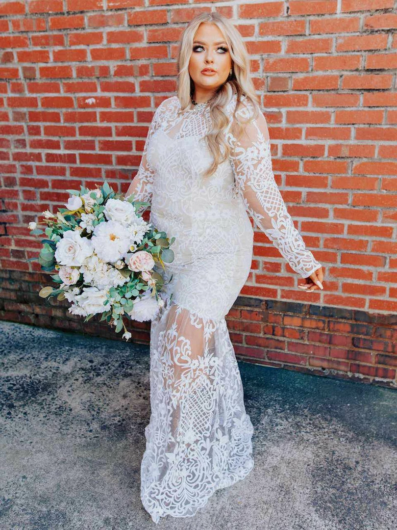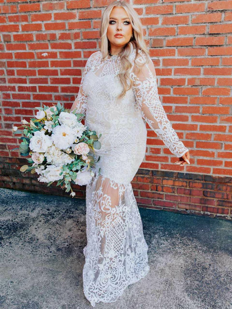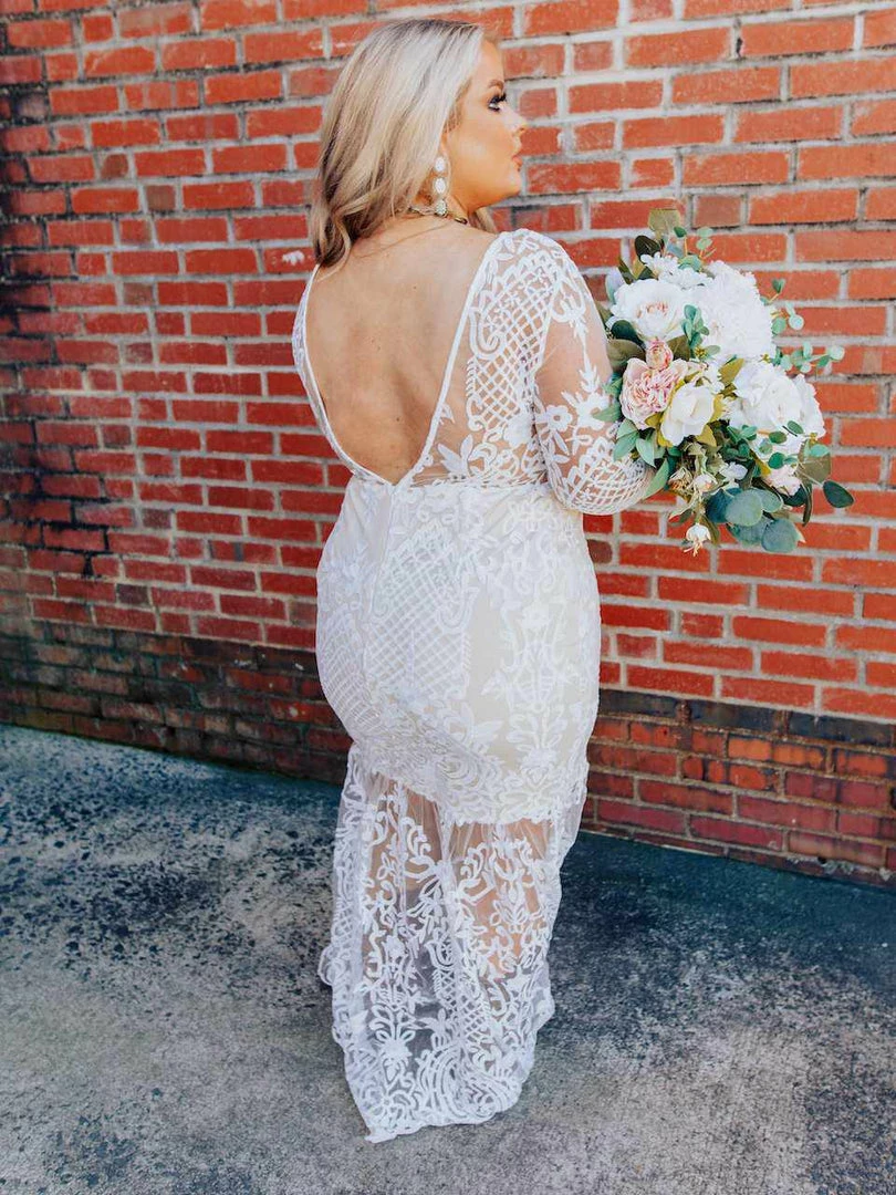 Just imagine how stunning you are going to look walking down the aisle in the World Stands Still dress featuring sheer long sleeves, a lace applique tulle illusion skirt, and a plunging open back.ย