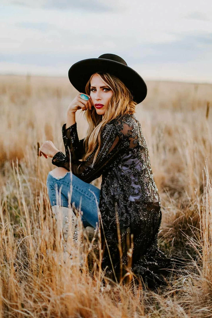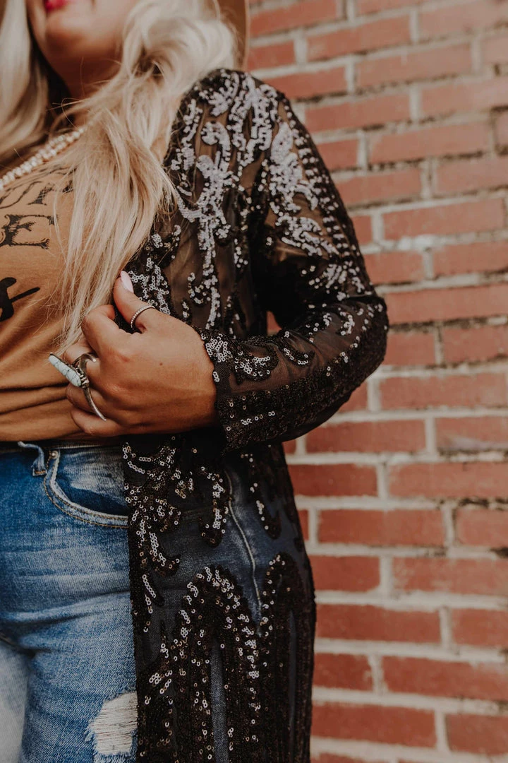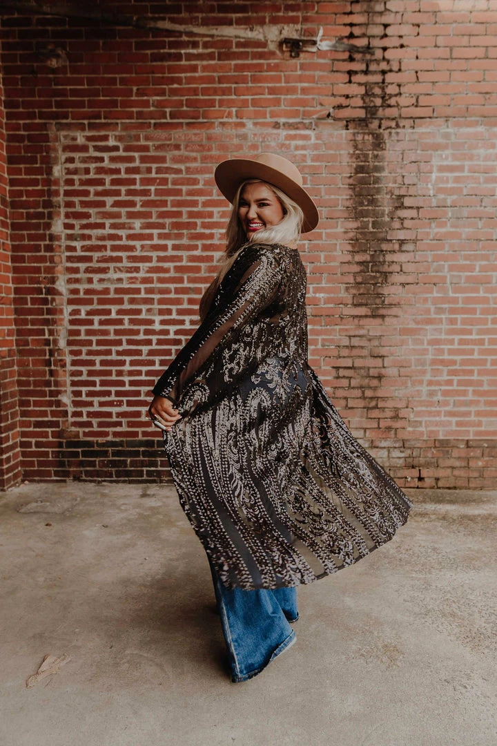 This handmade long kimono sequin duster is absolutely AMAZING! Great for special occasions, dates, or concerts. Even special for holidays like Christmas, New Years, and all year round events. With its lightweight flatteringย fit, it is sure to have you sparkle and shine anywhere you go! This piece is a LIMITED EDITION! Pair a duster with your favorite tops, bottoms or dresses for a sassy look!