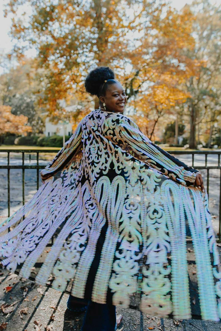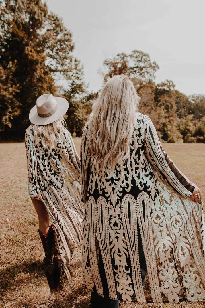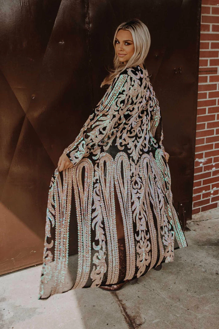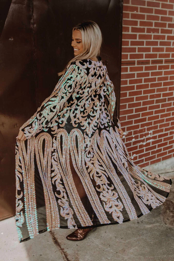 This handmade long kimono sequin duster is absolutely AMAZING! Great for special occasions, dates, or concerts. Even special for holidays like Christmas and the 4th of July. With its lightweight flatteringย fit, it is sure to have you sparkle and shine anywhere you go! This piece is a LIMITED EDITION! Pair a duster with your favorite tops, bottoms or dresses for a sassy look!