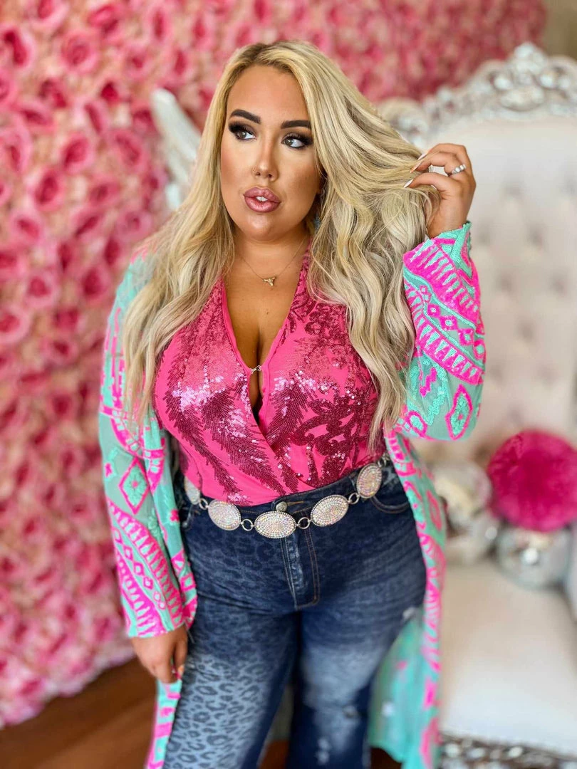 Handmade, this duster is absolutely AMAZING! Great for special occasions, dates, or concerts, this Southern Fried Chics Duster is a MUST HAVE! It’s long sleeve, has a complimentary fit, and is sure to have you sparkle and shining anywhere you go! This piece is a LIMITED EDITION! Pair this duster with your favorite tops and bottoms or dresses for a sassy look!