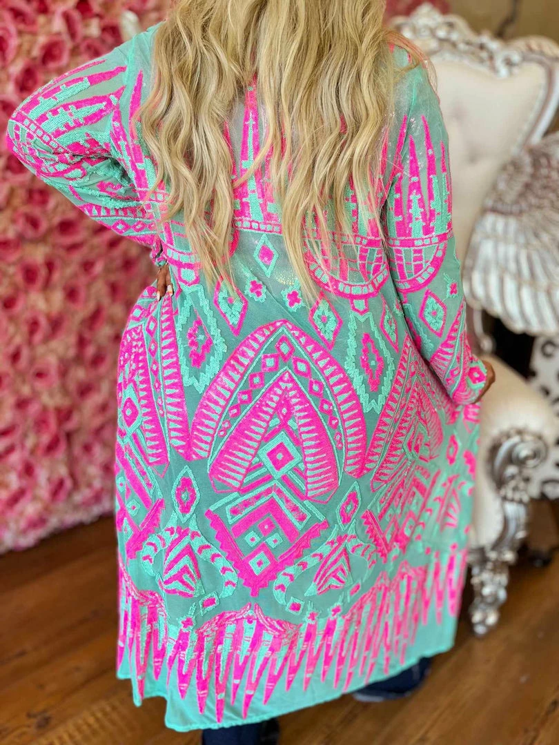 Kimono Style DusterΒ inΒ Mint and Hot Pink