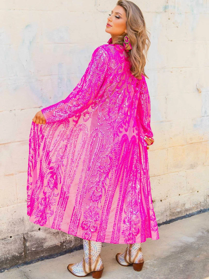 This handmade long sequin duster is absolutely AMAZING! Great for special occasions, dates, or concerts. With its complementary fit, it is sure to have you sparkle and shine anywhere you go! This piece is a LIMITED EDITION! Pair a duster with your favorite tops, bottoms or dresses for a sassy look!