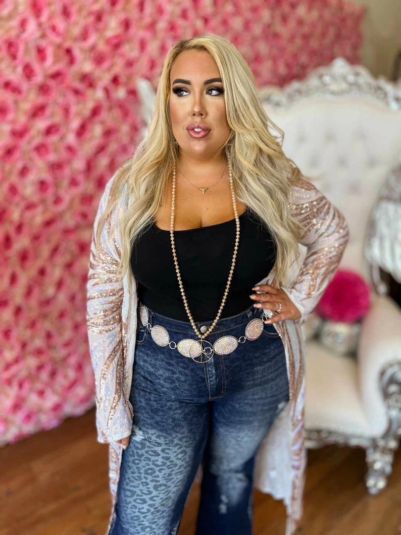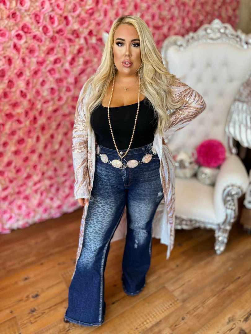 This handmade long kimono sequin duster is absolutely AMAZING! Great for special occasions, dates, or concerts. Even special for holidays like Christmas and the 4th of July. With its lightweight flatteringย fit, it is sure to have you sparkle and shine anywhere you go! This piece is a LIMITED EDITION! Pair a duster with your favorite tops, bottoms or dresses for a sassy look!