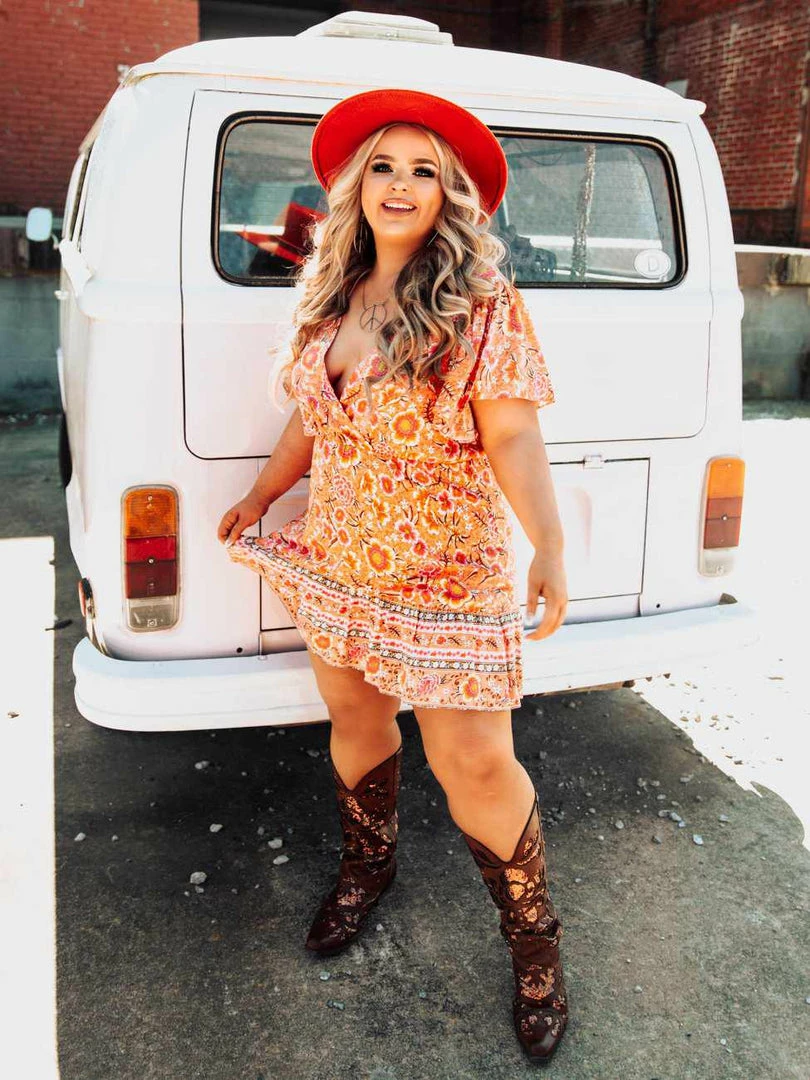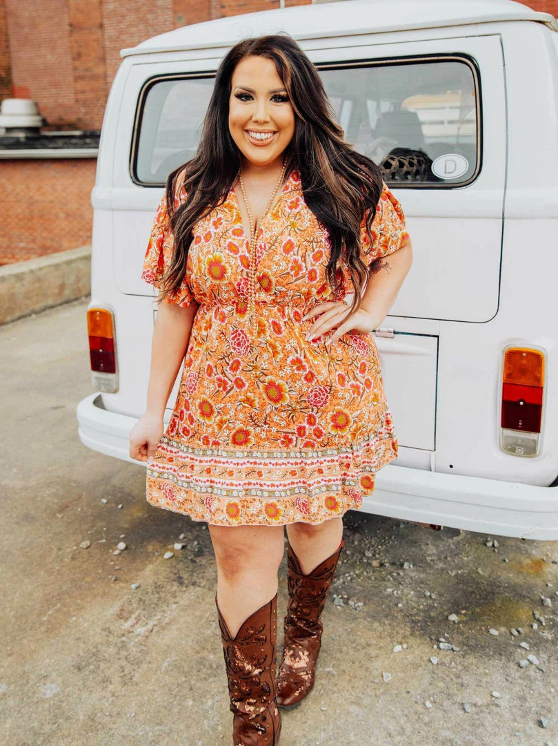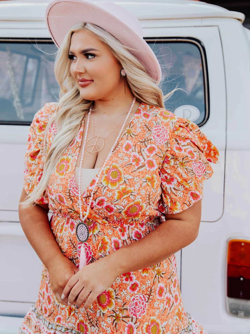 Made for golden hour sunsets, the Sunset Lover dress features beautiful hues of orange and pink flowers throughout. The ruffled sleeves and elastic waist make it the perfect combination of cute and comfortable. Curvy Chic approved and designed by our owner, Liz.ย