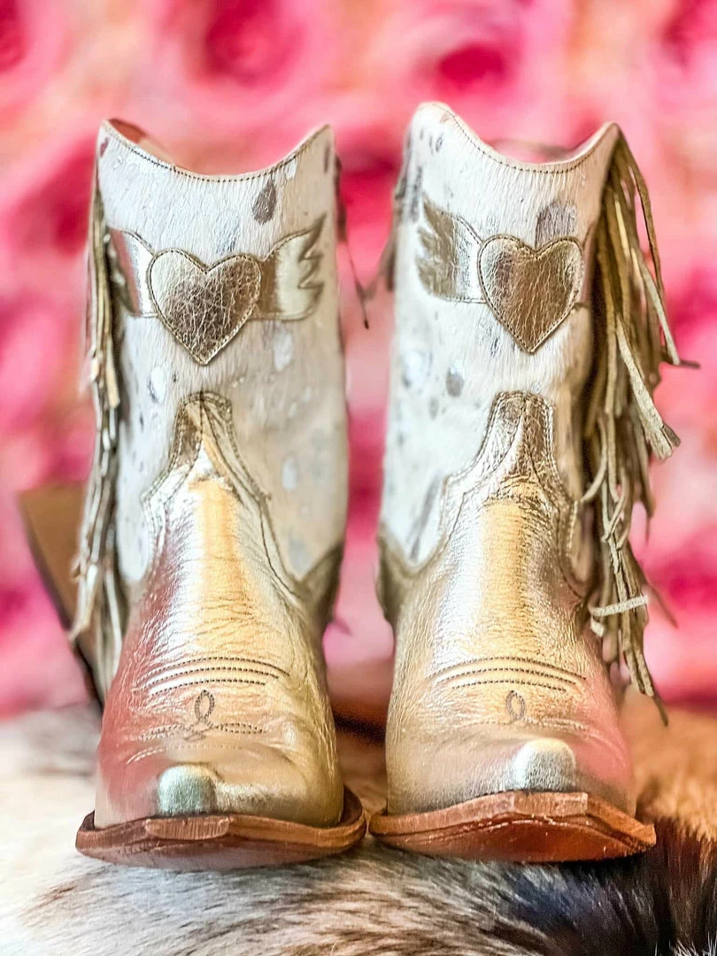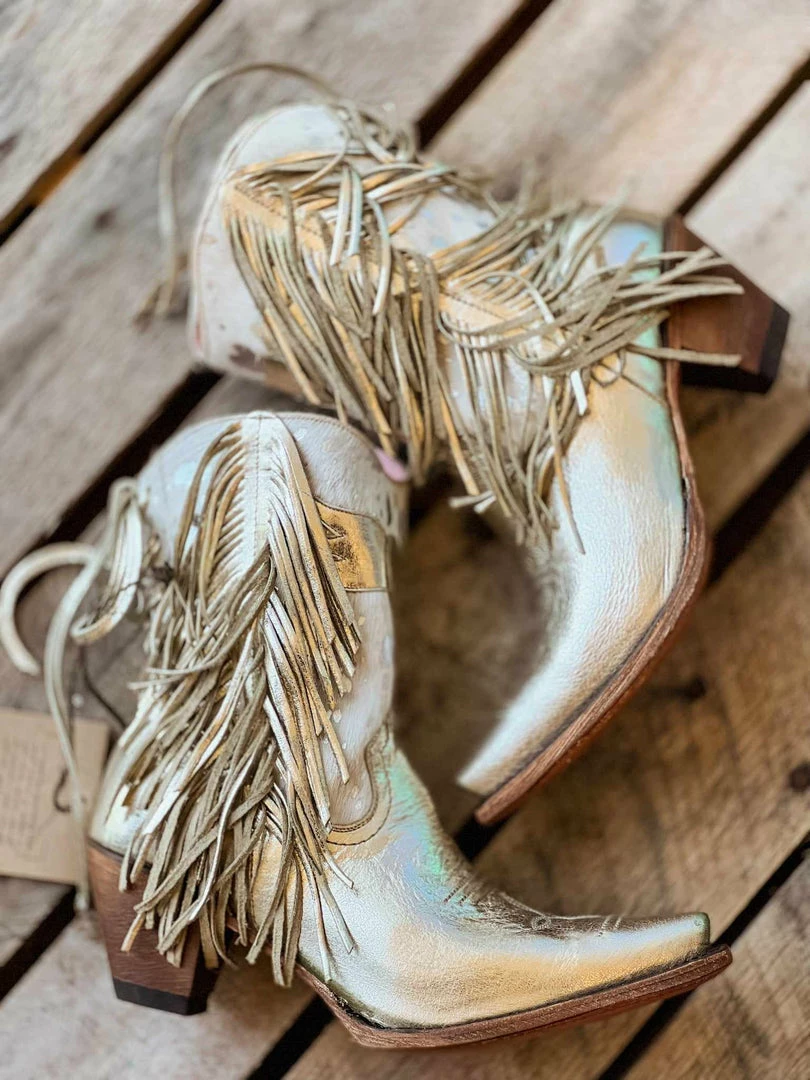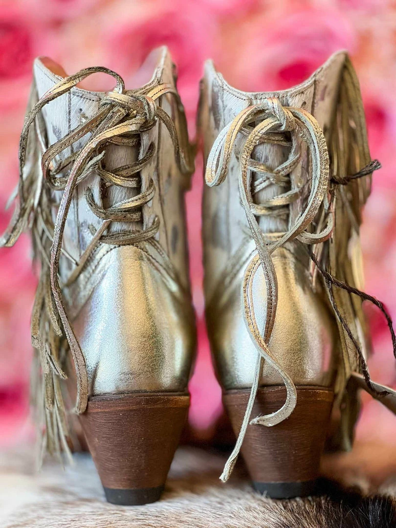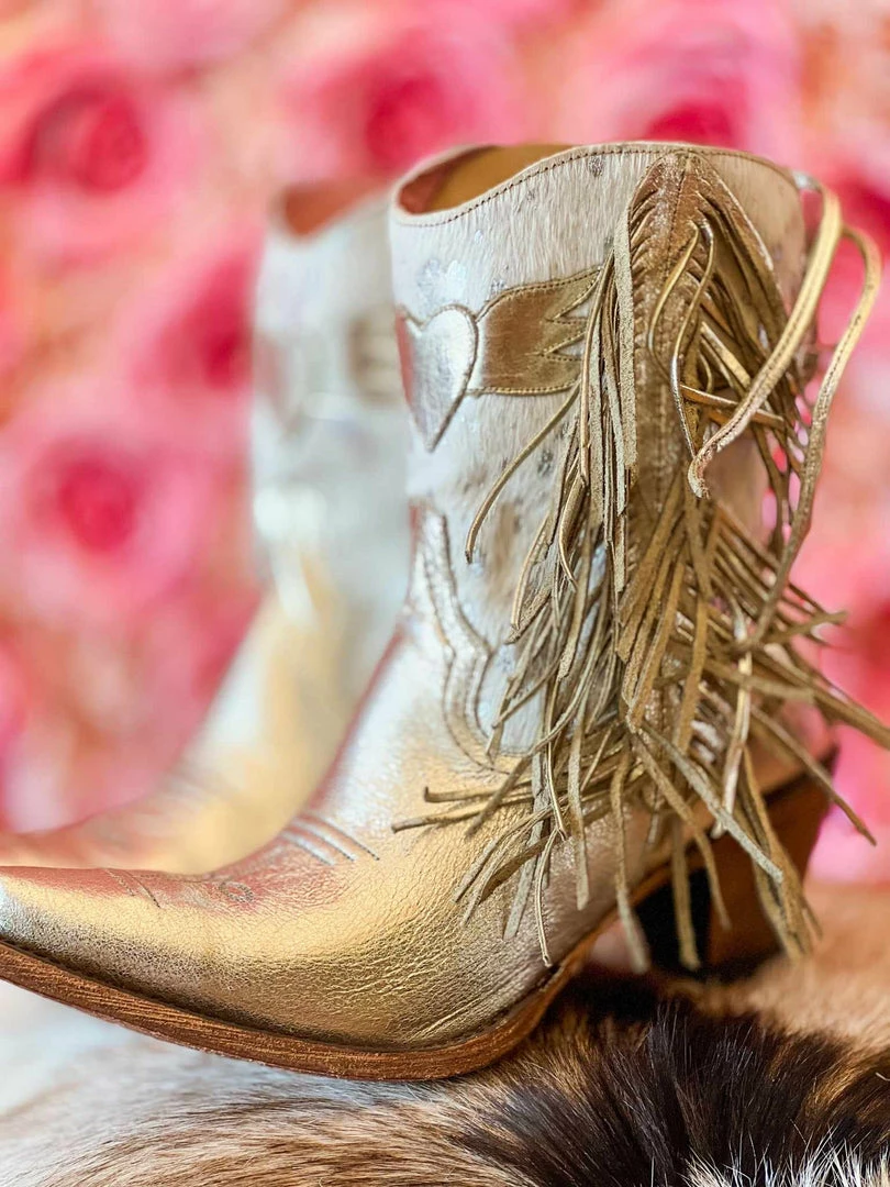 Shortie boots featuring an exclusive acid washed, hair on leather with metallicย fringe, contrast inner lining, a side zipper, medium heel, and a stylish snip toe.