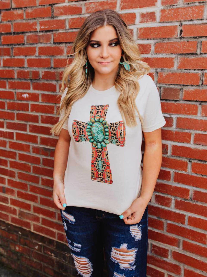 What more could you ask for? We are loving this heather peach-colored tee with the leopard and aztec cross with theΒ turquoise stone. This tee screams spring with beautiful serape printΒ and you can not forget your leopard and turquoise! Wear this tee for the Easter holiday!Β To complete this look, pair with your favorite types of denim and western boots! Printed on a soft style Bella Canvas Tee!