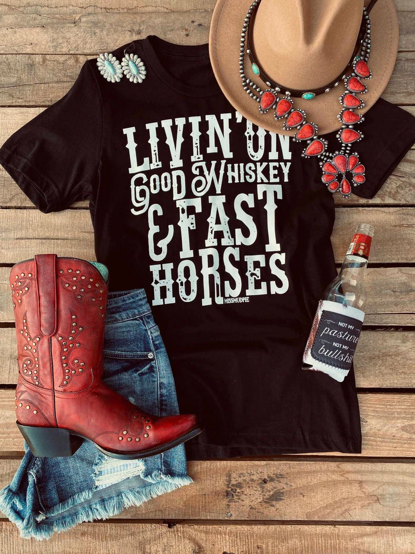 “Livin on Good Whiskey & Fast Horses” Tee! Printed on a soft style tee!
