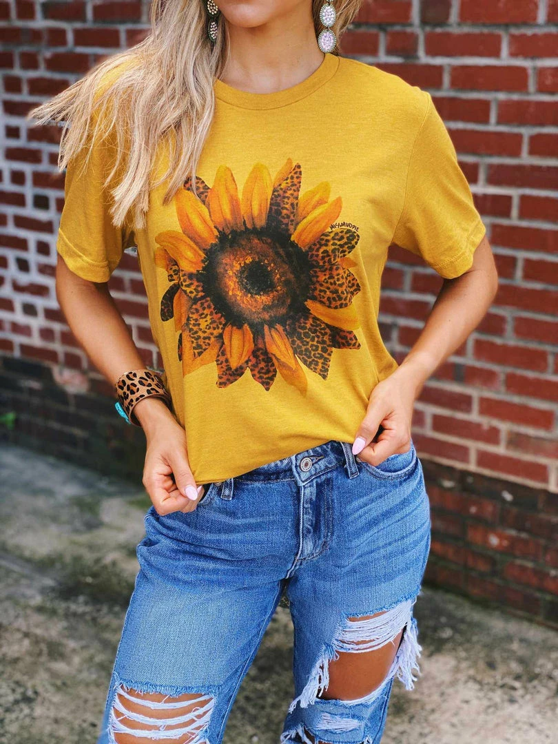 Sunflowers and Leopard! Oh yes! This tee features a leopard print sunflower! It’s a must! Pair it with a denim jacket for chilly nights by the fire or pair it with your Royal Sequin Duster to dress it up! Printed on a mustard, soft style Bella Canvas Tee!