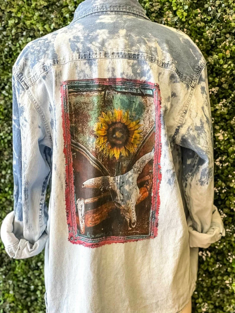 This denim button-down shirt is a must! Perfect for pairing your favorite graphic tees! This denim shirt is hand bleached with 15 hand-set crystals. This denim cut button-up shirt features an old school bus with a sunflower and skull. Custom-made just for you!Β