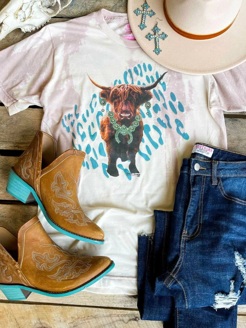 If I had a highlander, I’d want it to be dressed in squash blossom accessories too!Β Our western inspired tees are so much fun! This teeΒ has a bleached look. The little squash blossoms add the final touch to this tee!Β We love a great graphic tee! This tee screams festival and girls’ night out! Perfect for concerts and summer nights! Hand-dippedΒ with love! Printed on a soft style unisex tee.