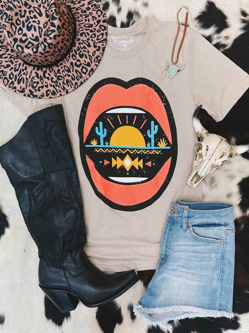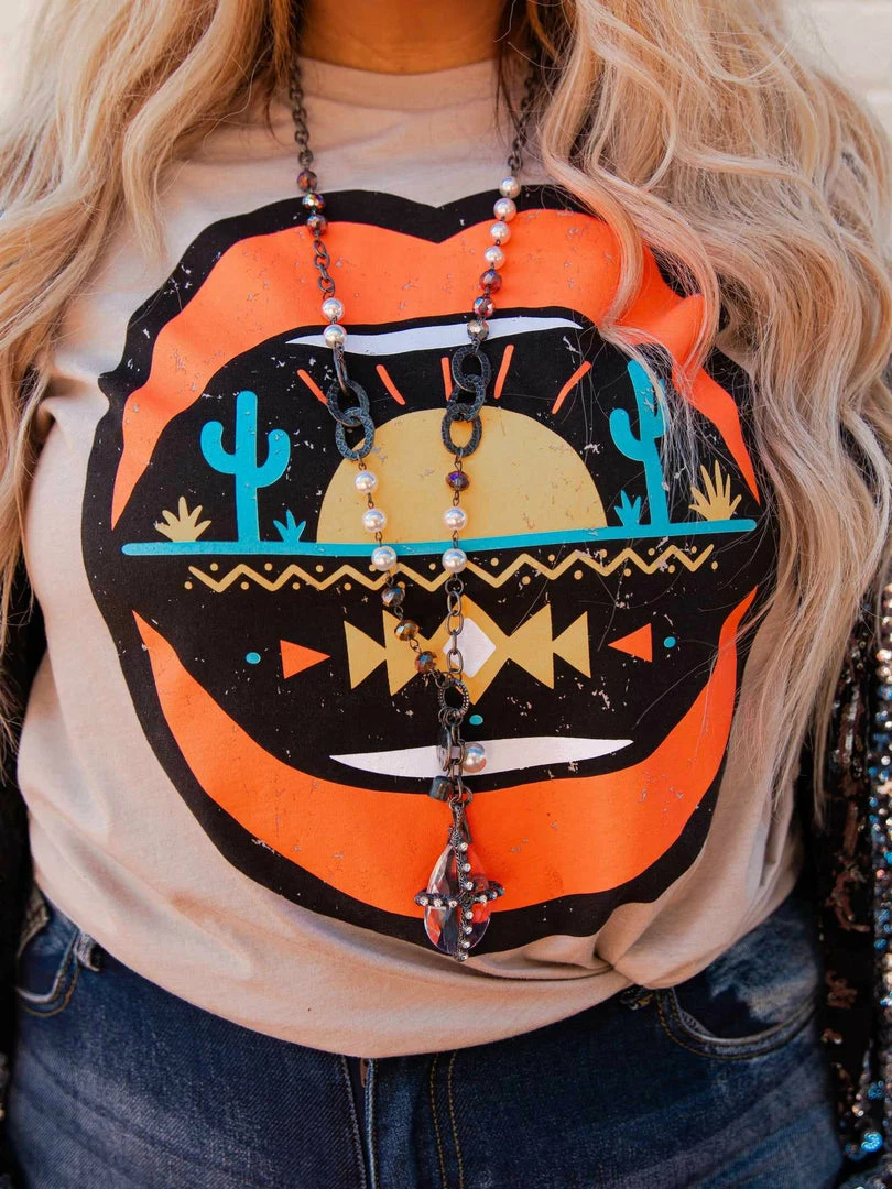 Desert lips tee! How cute! Pairs perfectly with your blue jean shorts and boots! Jam out at your favorite concert wearing this tee! We love the design! The lips with desert scenery! Printed on a natural-colored tee brings out the turquoise, orange, and golden colors!ย