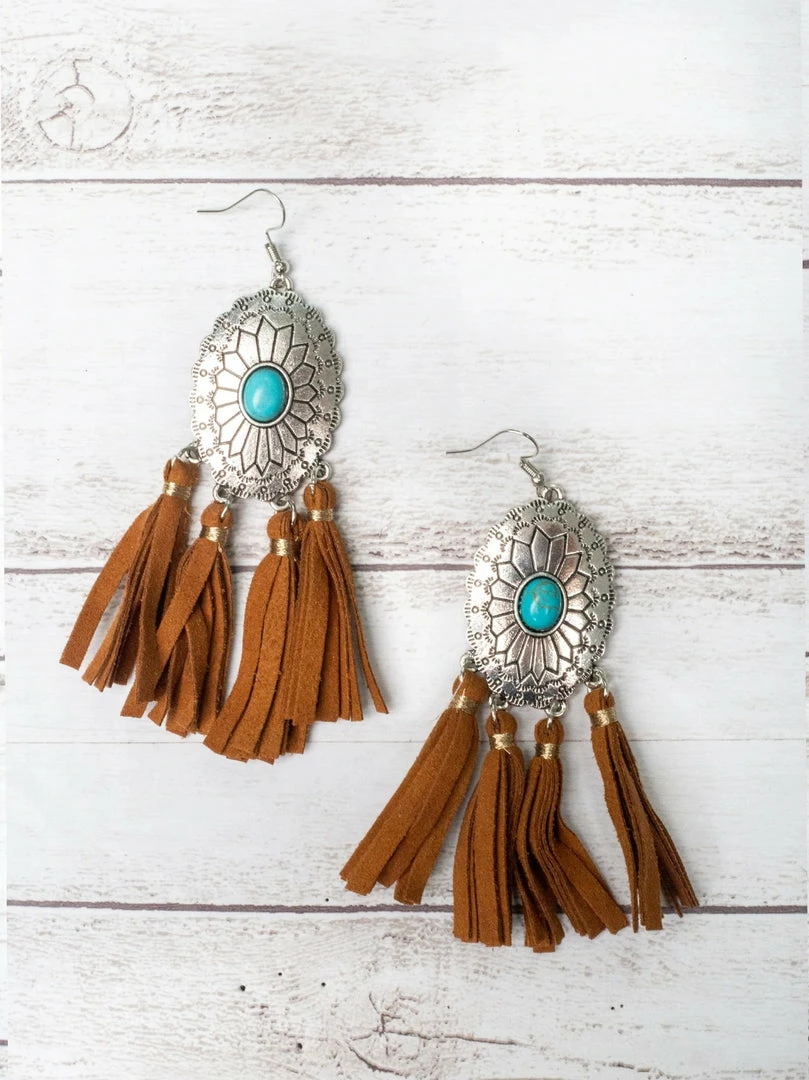 TheseΒ beauties are bound to become our go-to concho tassel earrings! With brown textured tassels and a beautiful turquoise stone, these earrings are neutral enough to match any outfit!