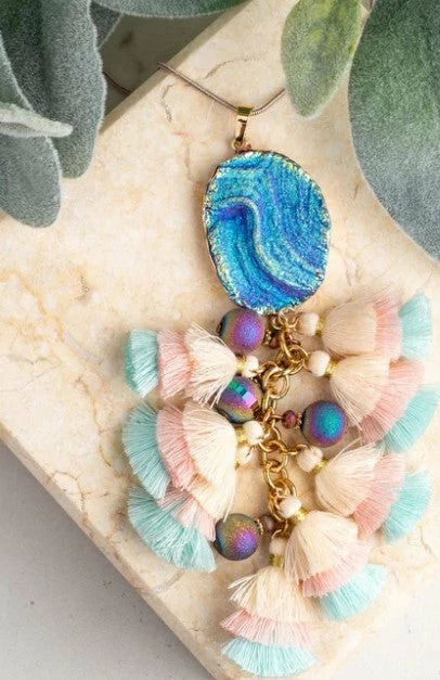 We’re not saying this blue natural stone pendant will lead you to a beach party, but we’re not not saying it will. Each of these beautiful blue cut stones has a unique pattern.