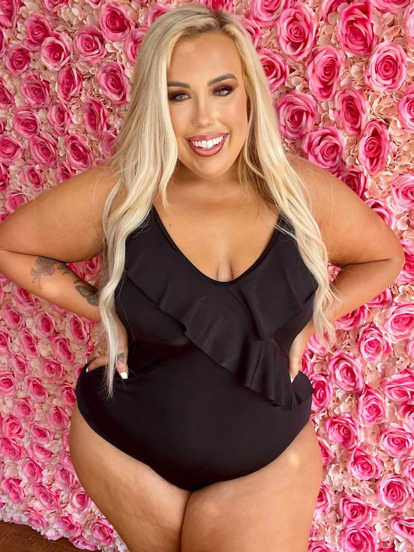 Every woman needs a “little black one-piece” in her swimsuit wardrobe! This classic black one-piece swimsuit features a flirty ruffle along the bust line and side – not only giving you extra coverage but also giving a little extra “Oomph” to a small bust!