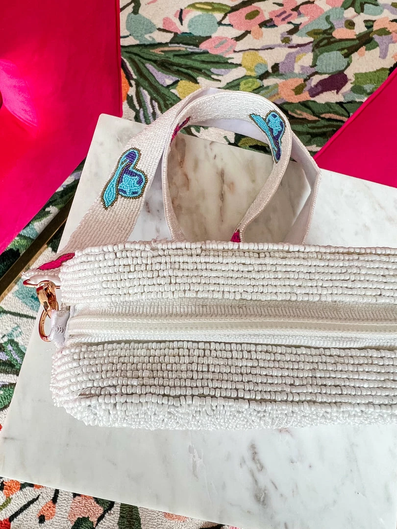 This beaded shoulder bag is absolutely covered in tiny seed beads for a fancy vintage look! Cute cowgirl boots decorate the from with pink and turquoise cowgirl hats along the strap.Β
